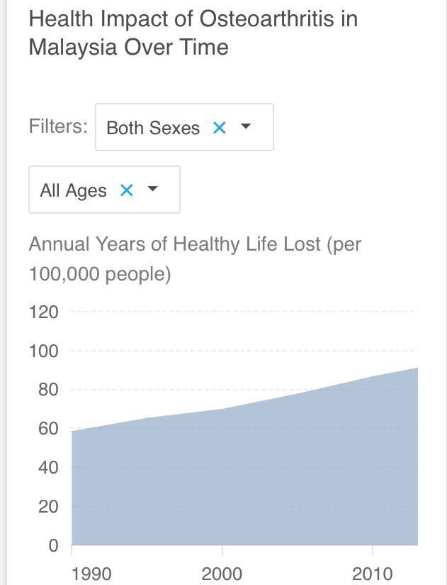The diagram below taken from http://global-disease-burden.healthgrove.com/l/76335/Osteoarthritis-in-Malaysia demonstrates the actual increase in total amount of cases being treated over the years.The steady incline of total amount of cases being treated is somewhat accelerated in 2000s to present day.