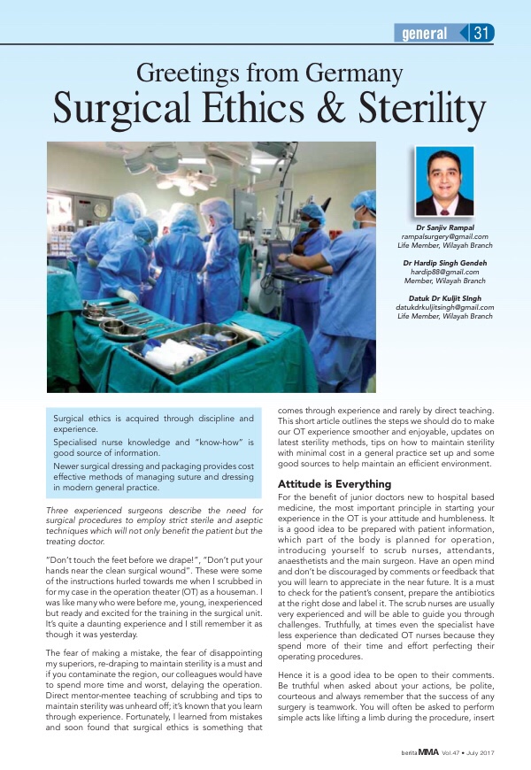 This an article by Dr Sanjiv Rampal which was co author by Datuk Kuljit Singh and Dr Hardip Singh Gendeh for Malaysia Medical Association Newsletter .The article touches an interesting topic of surgical ethics and serves a guide for junior doctors on their exposure to operation theatre for the first time.