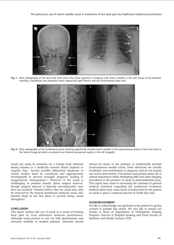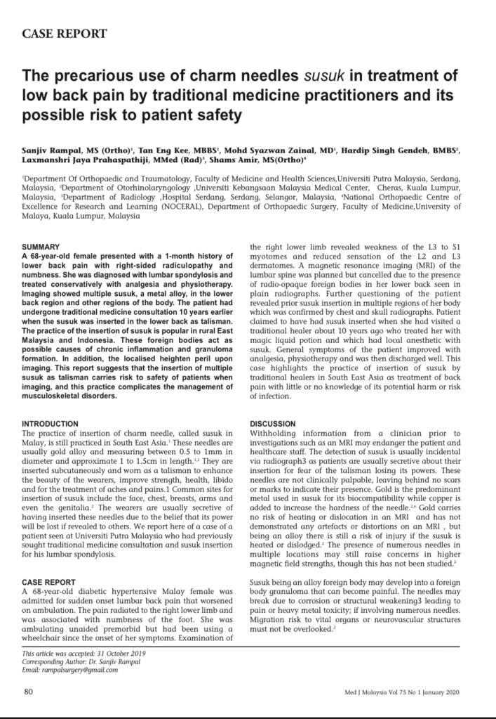 This is lastest publication from Research group associated with Rampalsurgery.com.This article mainly highlights the use talisman charm needles in traditional medicine practitioners locally.The use of such treatment has been used in the past mainly in South East Asia . With increase of globalization and travel,the presence of these charm needles in general practice should not be overlooked.