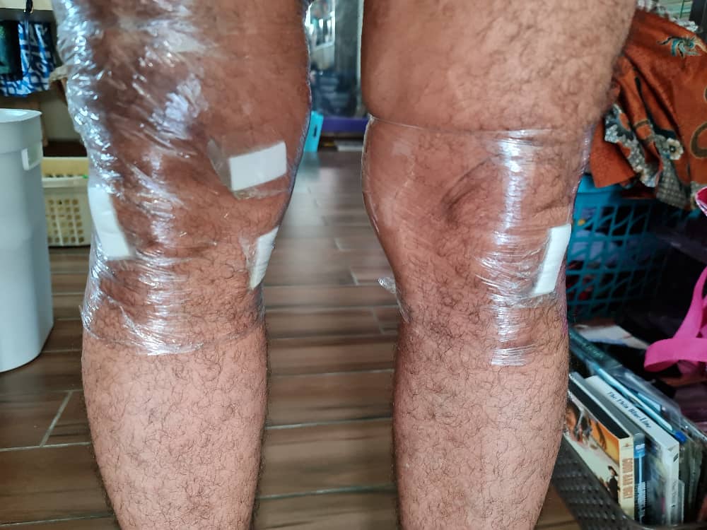 I would advise the patient to keep dressing for a duration of roughly 48 hours. It is vital to keep dressing dry post-procedure and example of a common example of such action is using common food plastic wrapper while showering like below