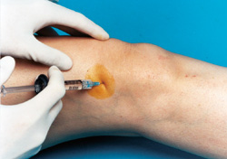 One common option of treatment at general practice clinics in the region would include injection into the knee with various medications, called intra-articular injection.