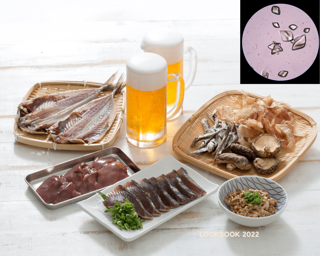 Picture shows the type of food that high in purine content that may contribute to uric acid formation.