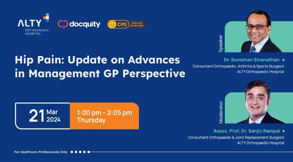 That’s why we’re excited to invite you to an upcoming webinar on Hip Pain and GP Management Update, moderated by Associate Professor Dr Sanjiv Rampal and presented by Dr Sureshan Sivananthan. This informative session will be hosted on the international medical app, Docquity, on Thursday, March 21, 2024, from 1:00 PM to 2:00 PM.