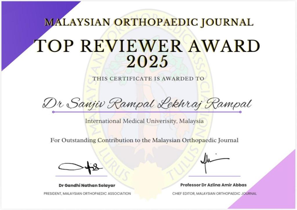 Deeply honored to receive the Top Reviewer Award 2025 from the Malaysian Orthopaedic Journal,